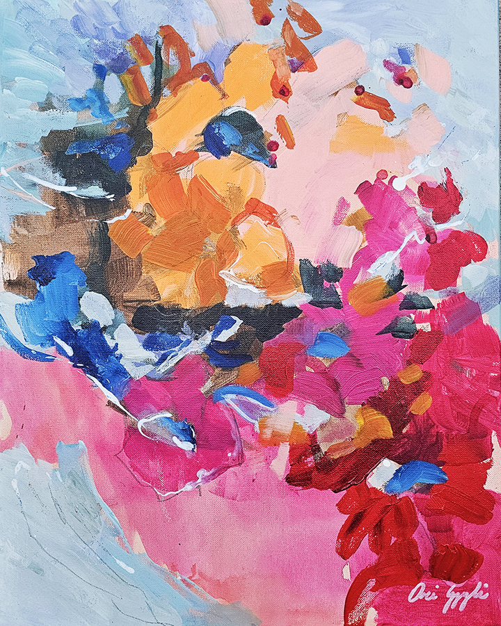 Sunlit Petals is an original acrylic painting filled with radiant energy, layered florals, and joyful color movement. Bright pinks, warm oranges, and soft blues evoke sunlight, celebration, and Mediterranean warmth.